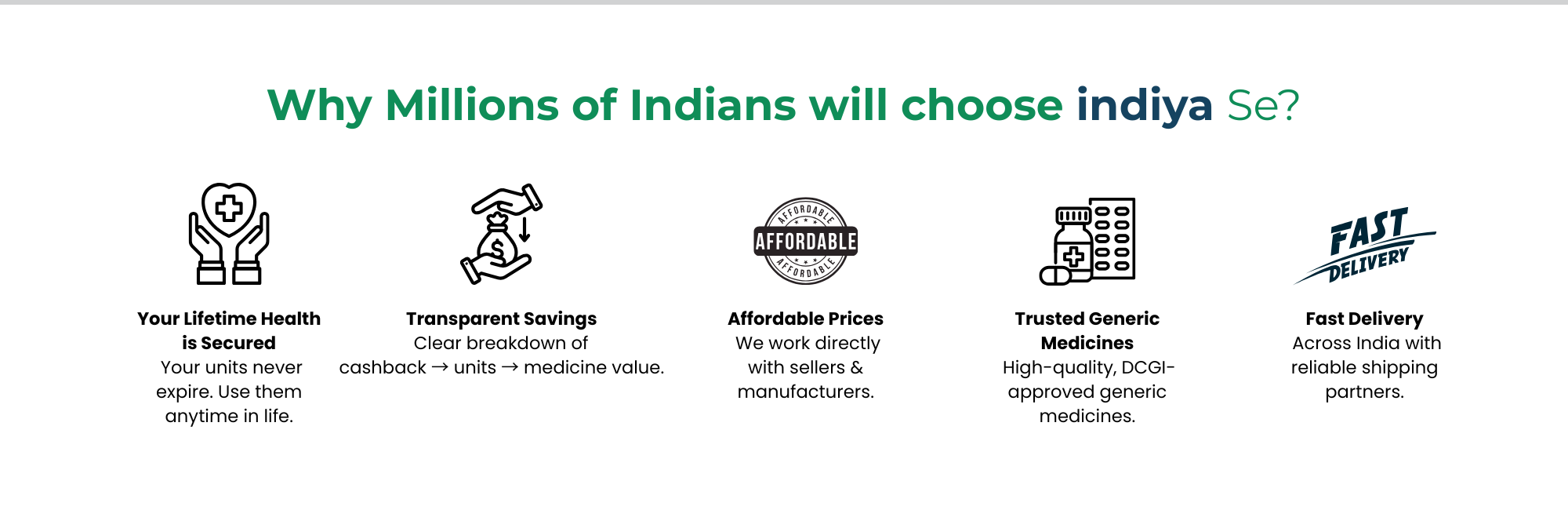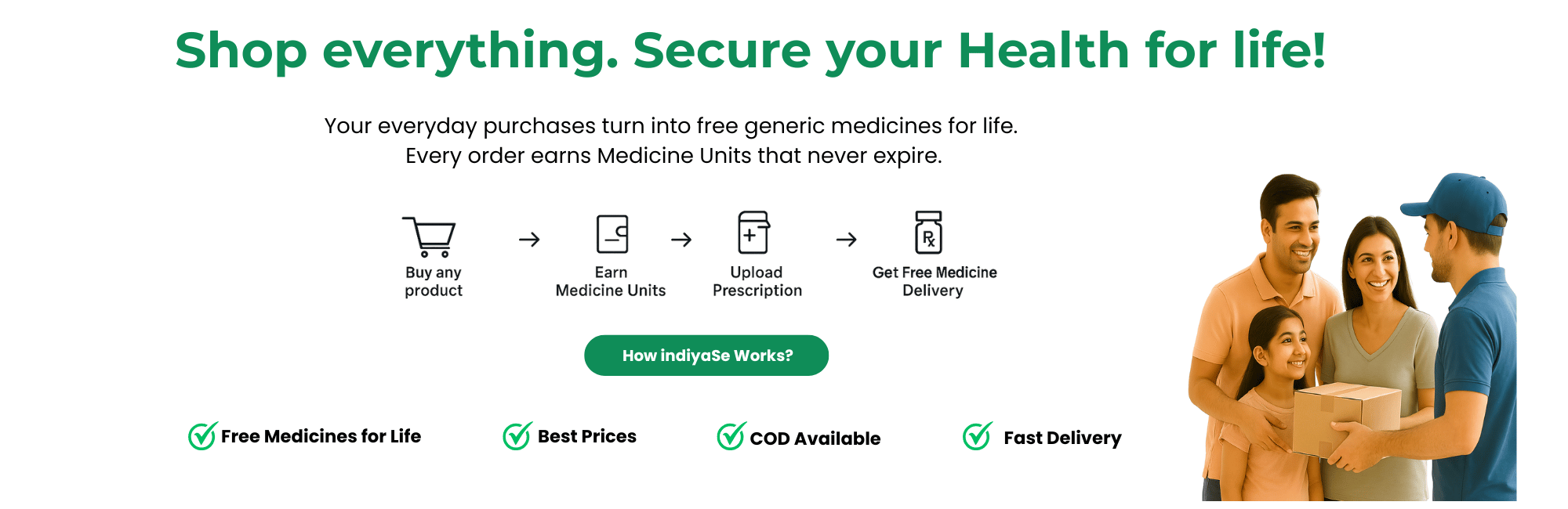 Every time you shop on IndiyaSe, you earn Medicine Units.These units stay in your wallet forever and can be used anytime to get 1,800+ generic medicines completely free.