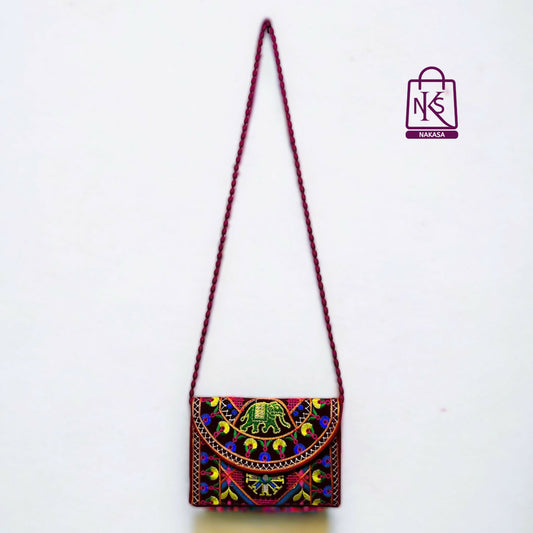 = Cashback Units 89/-NAKASA Women's Ahmedabadi Handmade Elephant and Flower Embroidery Small Maroon Clutch Bag