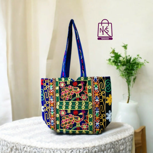 = Cashback Units 239/-NAKASA Women's Rajasthani Handmade Peacock Embroidery Regular Blue Tote Bag