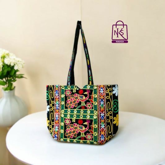 = Cashback Units 239/-NAKASA Women's Rajasthani Handmade Peacock Embroidery Regular Black Tote Bag