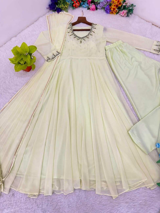 = Cashback Units 421/-New Party Wear Fox Georgette Gown Set with Dupatta & Pant | Heavy Handwork Neck Design