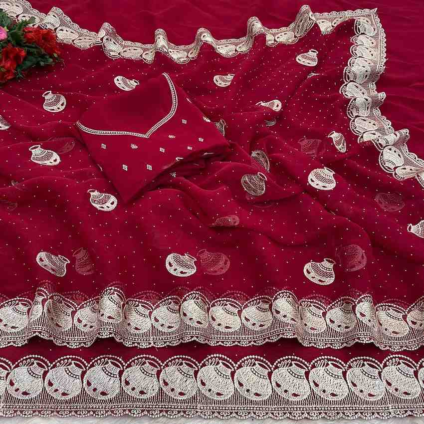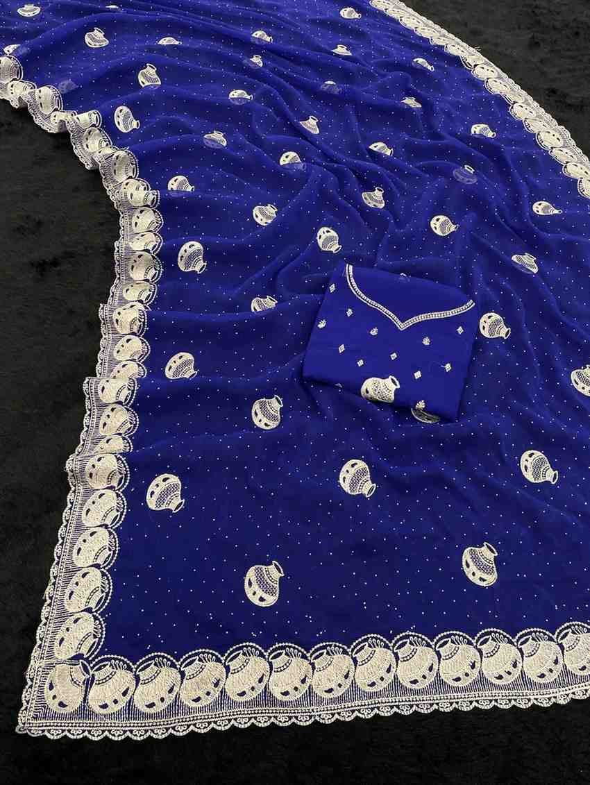 This saree is made from premium shimmer fabric (5.4 m) with beautiful stone work. The silk blouse piece (0.8 m) is unstitched and can be tailored to your size. Suitable for daily wear, parties, and festivals.